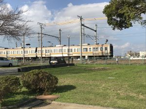 この公園の真ん前(北側)に電車の線路があるんですね。