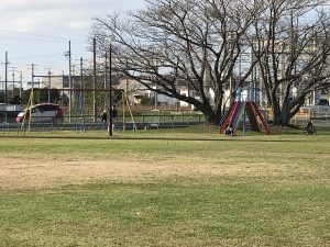 この公園の遊具は、ブランコ、滑り台、鉄棒があって遊具は少ないです。